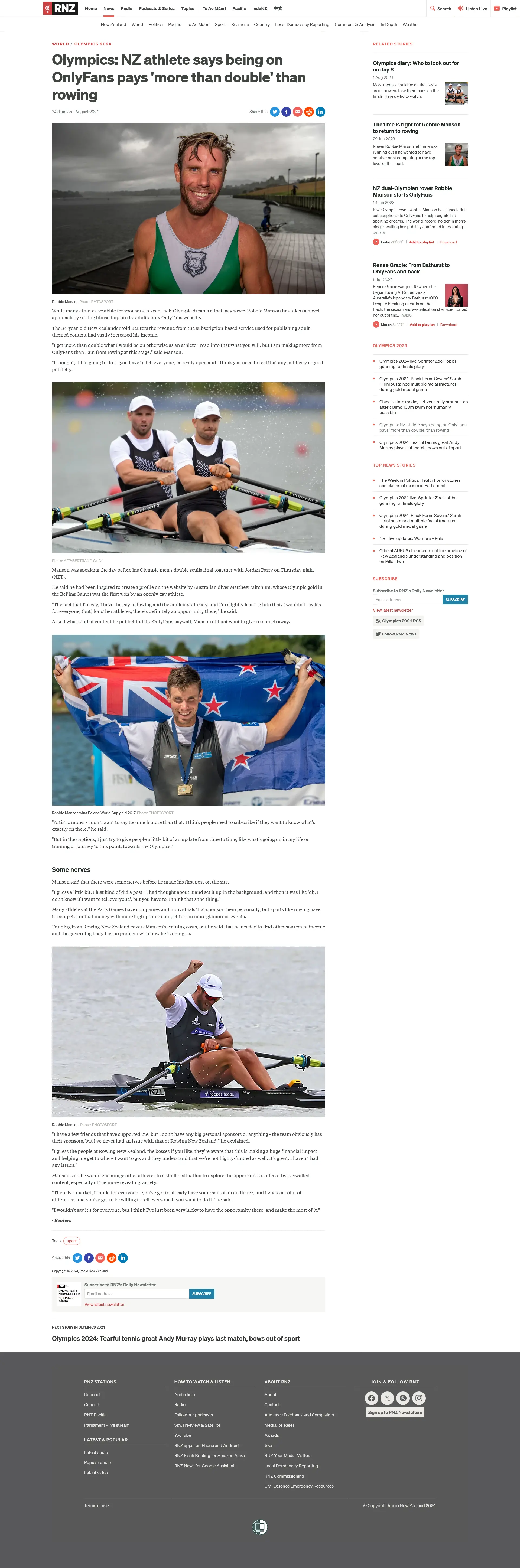 当许多运动员争先恐后地寻求赞助商以保持他们的奥运梦想时,同性恋赛艇运动员罗比·曼森(Robbie Manson)采取了一种新颖的方法,将自己设在仅限成人的OnlyFans网站上。