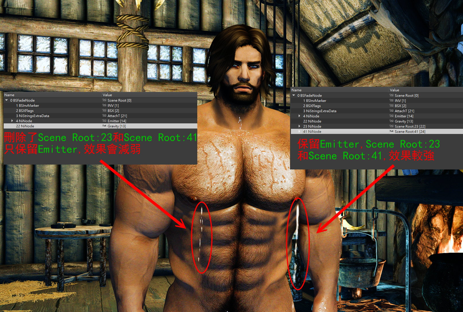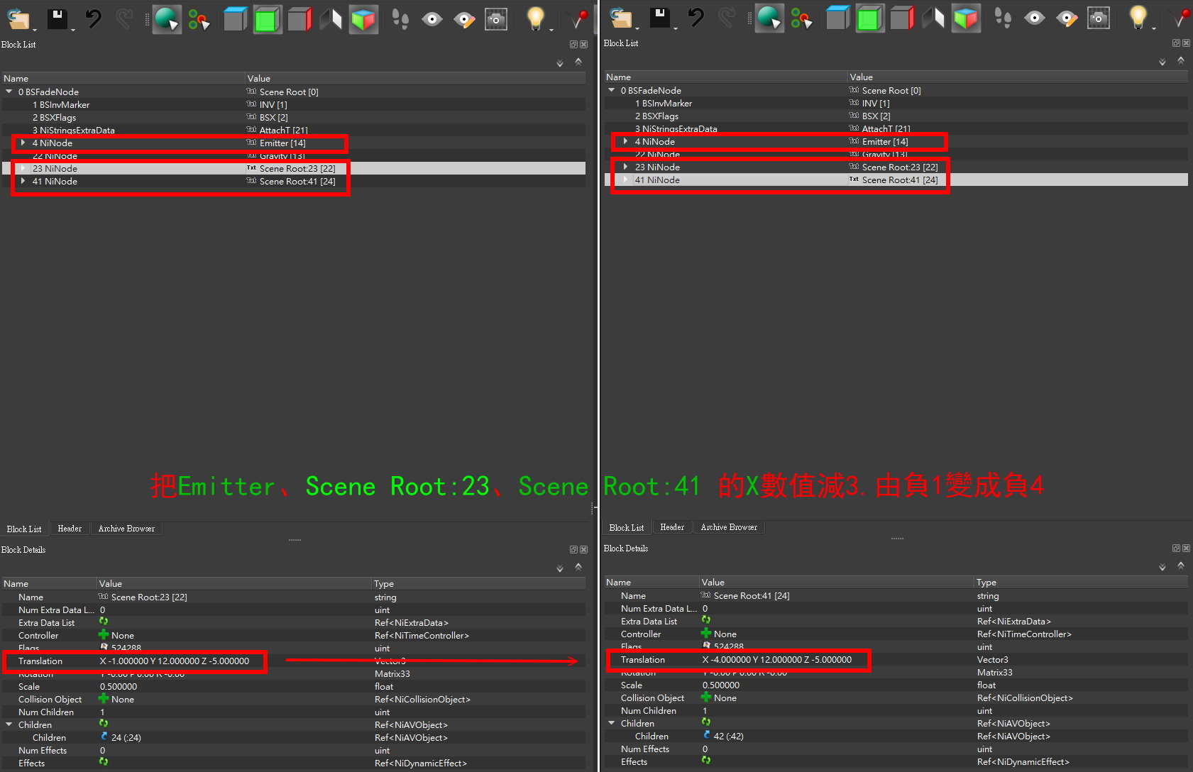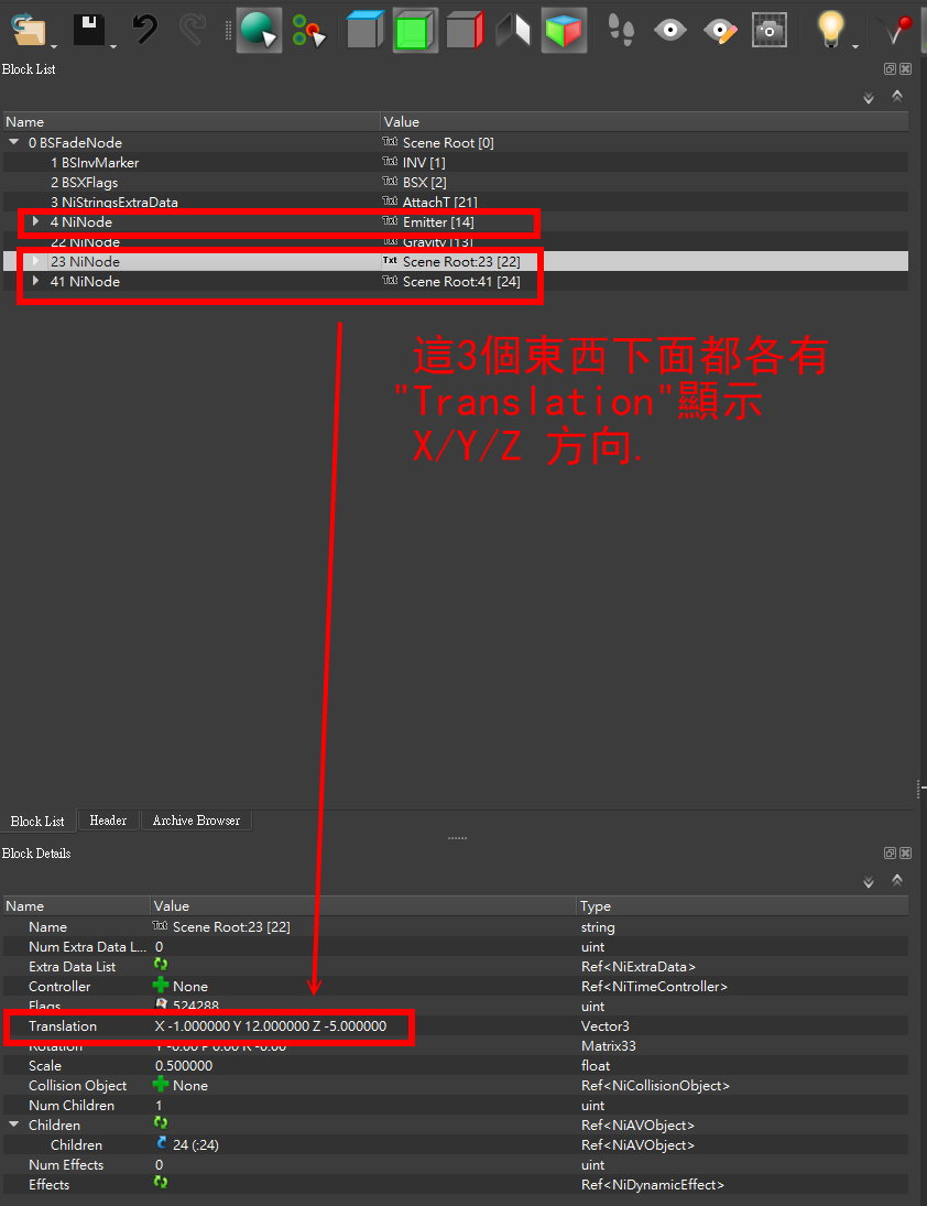 2. 用NifSkope打開 MME_MilkLeakL.nif 和 MME_MilkLeakR.nif. 你會看到3個東西 -- Emitter, Scene Root:23, Scene Root:41. 這3個東西下面都各有"Translation"顯示 X/Y/Z 方向.