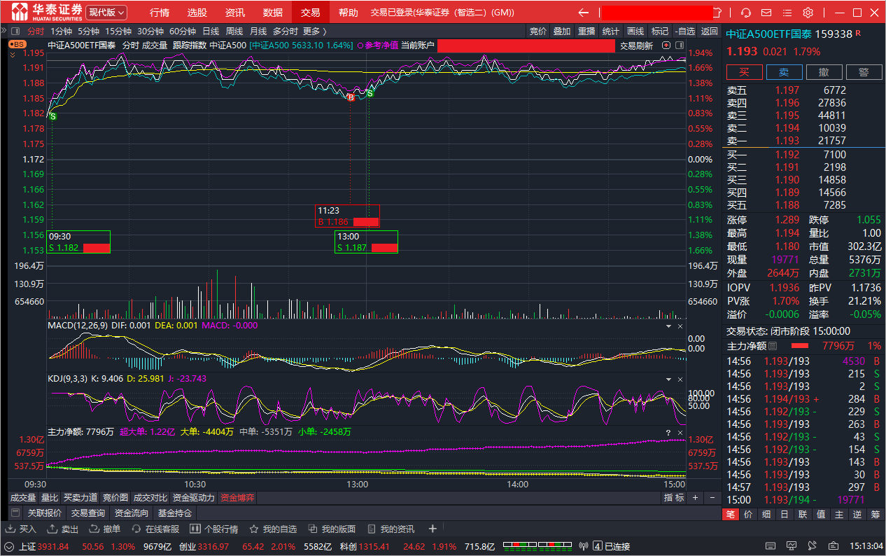 上午11时23分,观察到KDJ多次金叉,以1.186元价格买入,随后挂单1.188元卖出,但是不知道是手抖了还是怎么的,挂成了1.187元,于下午13时00分成交,晕。