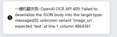 选区 #2: OpenAI API 400: Failed to deserialize the JSON body into the target type: messages[0]: unknown variant `image_url`, expected `text` at line 1 column 172509