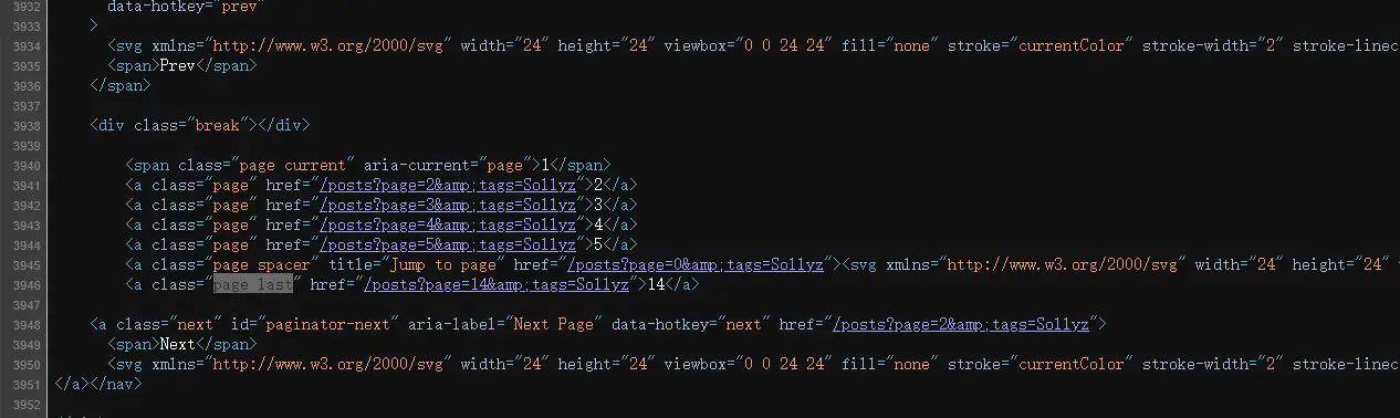 当然,某个关键词的图片不一定只有一页 所以我们需要找到所有页码,然后经过一番分析,也很容易找到class为last page的a标签内部文本就是页码长度,所以到时候请求的时候只需要进行14次分页请求,如果有想要尝试的可以去找找这段 这个文本应该如何提取呢,通过分析发现,在整个页面中,class="last page"只出现了一次,也就是说,使用bs4的find即可找到这个标签